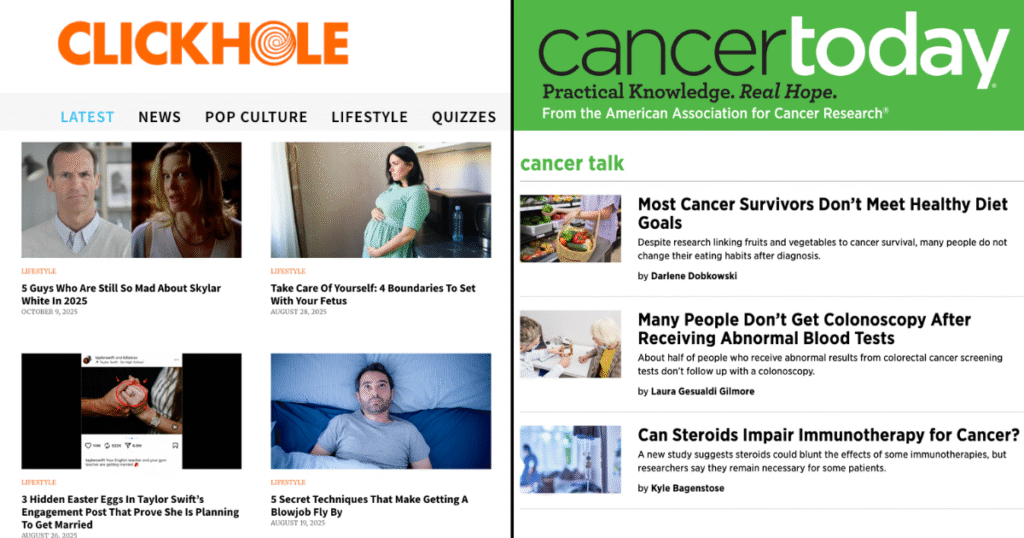 On the surface, ClickHole.com and Cancer Today magazine may seem similar, perhaps even interchangeable, when it comes to quality and content. But once you dissect the two of them and compare them side by side, ClickHole stands out as the clear winner. Let’s explore.