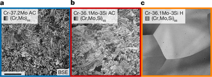 When oxidized, corundum prototype (Strukturbericht designation D51; Extended Data Fig. 4) Cr2O3 was verified by XRD and scanning electron microscopy energy-dispersive X-ray spectroscopy (SEM-EDS) for all scales examined in this study. For the Si-containing Cr-36.1Mo-3Si, a continuous, well-adherent oxide layer of uniform thickness (Fig. 3a) was obtained for AC and H oxidized at 800 °C for 100 h. The scale thicknesses are (1.7 ± 0.3) and (3.9 ± 2.4) µm (Extended Data Fig. 6d), respectively. This is in strong contrast to the porous, layered microstructure shown in Extended Data Fig. 5 with a total thickness of (91 ± 24) µm formed on the Si-free Cr-37.2Mo under the same conditions. On the basis of the thickness, the area-specific mass gains by the Cr2O3 growth \(\frac{{\Delta m}^{{\rm{scale}}}}{A}\) (Extended Data Fig. 6d) can be estimated. The scale growth accounts for specific mass gain of (+0.9 ± 0.2) or (+2.0 ± 1.2) mg cm−2 in Cr-36.1Mo-3Si AC and H, respectively, and is thus similar to the experimentally obtained \(\frac{{\Delta m}^{\text{exp}}}{A}\) of (+0.01 ± 0.03) and (+0.00 ± 0.03) mg cm−2. A slight mass loss by MoO3 evaporation in the transient stage of oxidation is unavoidable; however, it does not affect the long-term behaviour of the alloy. By contrast, the substantial difference between the expected \(\frac{{\Delta m}^{{\rm{scale}}}}{A}=(+47\pm 12)\,{\rm{mg}}\,{{\rm{cm}}}^{-2}\) and the negative experimental \(\frac{{\Delta m}^{\text{exp}}}{A}=(-5.6\pm 0.4)\,{\rm{mg}}\,{{\rm{cm}}}^{-2}\) indicate considerable MoO3 evaporation in the case of Cr-37.2Mo. As well as the mass-change observations, the analysis of scale thicknesses at intermediate times allows for an assessment of the growth kinetics (Extended Data Fig. 6). Consistent with the MoO3 evaporation and the porous, non-protective oxide scale on the Si-free Cr-37.2Mo, a linear scale growth behaviour is obtained. In accordance with the pronounced reduction of the evaporation, the Si-containing Cr-36.1Mo-3Si exhibits a parabolic Cr2O3 growth, with (15 ± 10) × 10−14 and (5.9 ± 1.6) × 10−14 cm2 s−1 for AC and H, respectively. This proves a diffusion-controlled growth of a passivating scale on Cr-36.1Mo-3Si at 800 °C.