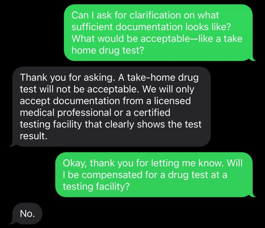 the petty in me would push to make it mandatory that everyone is drug tested so they have to come out of pocket for a lot more than one test but you got real life bills