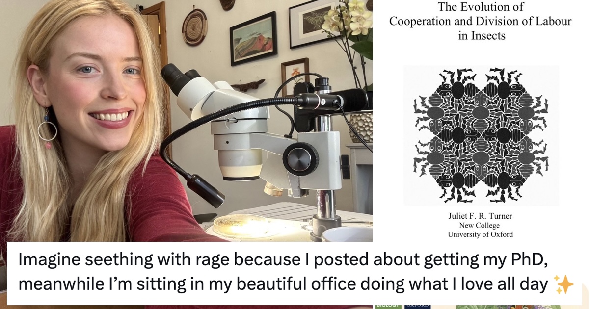 It’s @juliet_turner6, an ecologist & evolutionary biologist and newly-qualified DPhil at the University of Oxford who really got some people’s backs up when she went on Twitter to celebrate this.