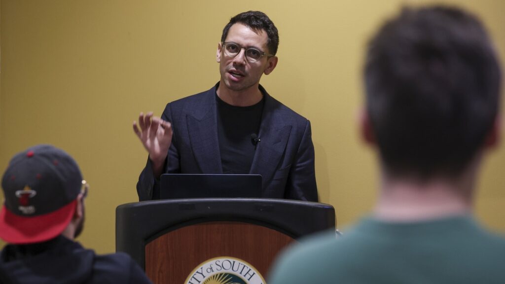 James Fishback, CEO of investment firm/asset manager Azoria, speaks at the Marshall Student Center, Oct 6, 2025, in Tampa, Fla.