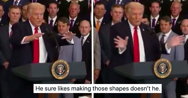 Look no further than this clip of the President addressing a room full of collegiate athletes at the White House. In a speech welcoming his visitors — again, a room full of college kids — Trump speaks about drinks and cocktails. As he’s discussing these cocktails, he makes an awkward hand gesture.