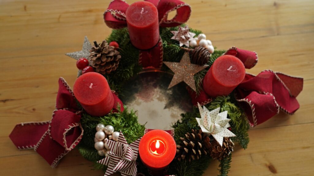 An Advent wreath, traditionally lit in the four weeks leading up to Christmas.