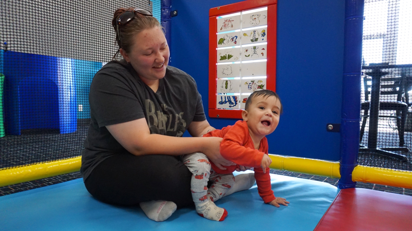 At an indoor play center in Cheyenne, Wyo., a sea of toddlers throw around colorful blocks and balls. Grace Moreno, who is 21, is there with her 11-month-old son, who is dressed in pajamas with little firetrucks on them.