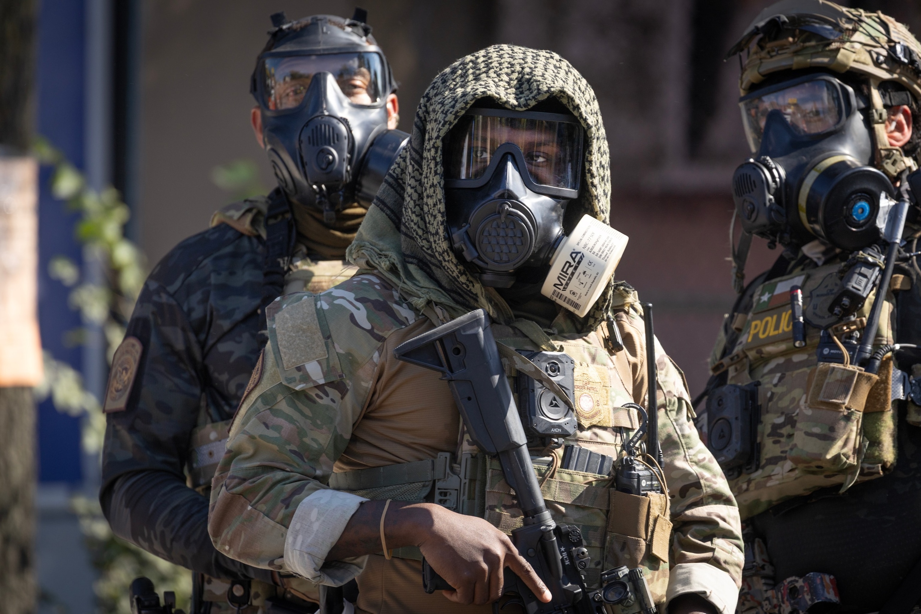 Federal law enforcement agents stand guard as they are confronted by community members and activists for reportedly shooting a woman in the Brighton Park neighborhood on October 4, 2025 in Broadview, Illinois.
