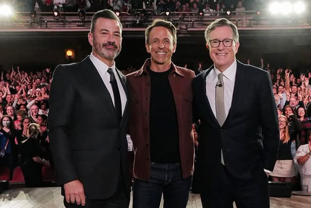 Colbert, who shared the same post, is scheduled to appear on Jimmy Kimmel Live on Tuesday, while Kimmel is scheduled to appear on Colbert’s The Late Show on the same night. Meyers was not listed on either show’s guest lineup, but it appears that he dropped in for JKL‘s segment with Colbert.
