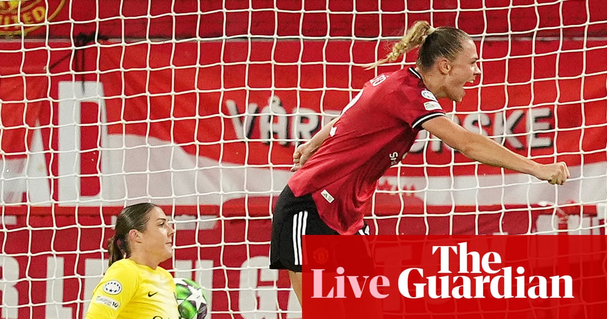 27 min: Half chance for United’s Miyazawa! Riviere chips in a hopeful cross, Earps comes to punch (successfully) but the bouncing ball falls to Miyazawa on the edge of the area … Earps is still recovering her footing from punch … the goal is tantalisingly untended … but Miyazawa can only shoot high and wide. It was a tough chance in truth, the ball coming quickly and awkwardly towards the United midfielder.