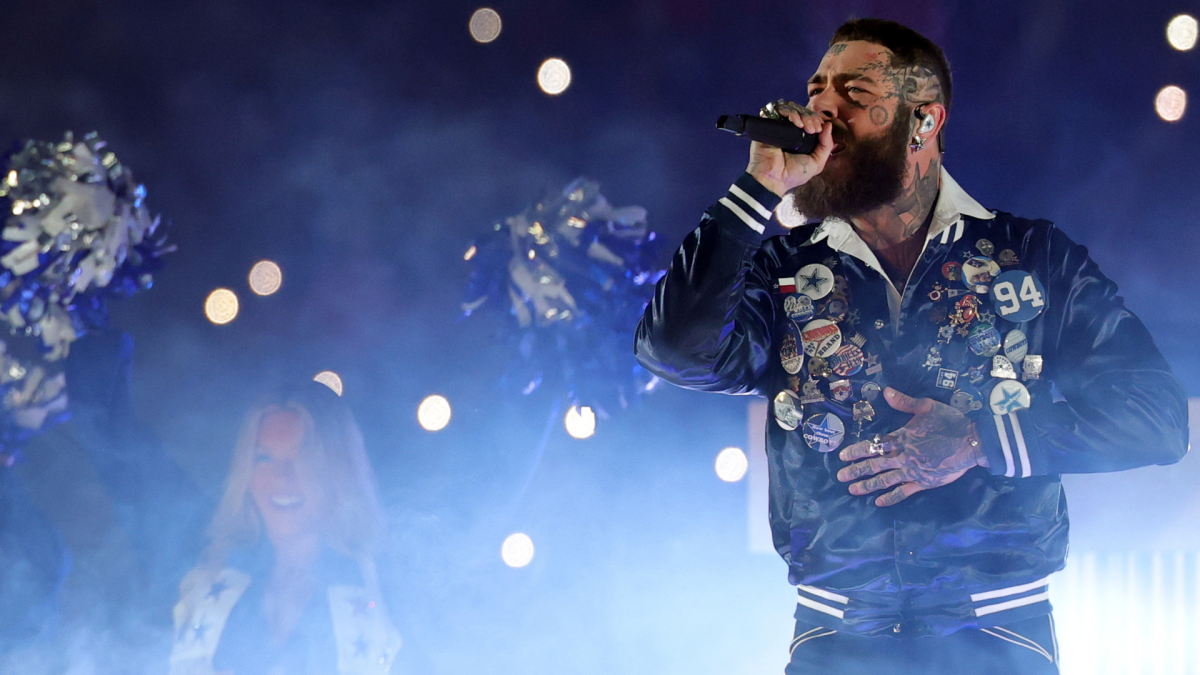 Post Malone, never shy about his football fandom, wore Cowboys’ cowboy boots and called them the greatest team in the world, pumping up the Dallas crowd.