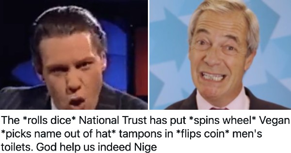The *rolls dice* National Trust has put *spins wheel* Vegan *picks name out of hat* tampons in *flips coin* men’s toilets. God help us indeed Nige https://t.co/yjIwW9iIS9