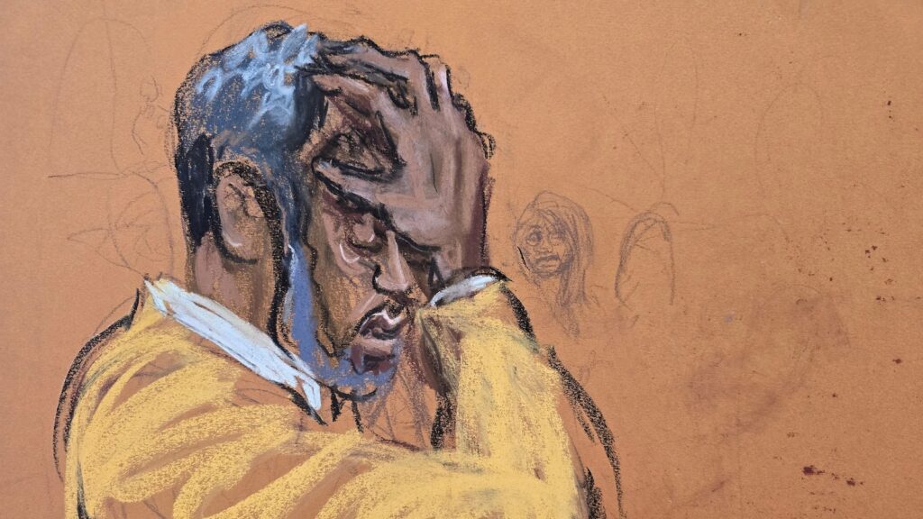 Sean ‘Diddy’ Combs listens as Judge Arun Subramanian pronounces the sentence during Combs’ sentencing hearing, after he was convicted of transporting prostitutes for drug-fueled sexual performances, in New York, Oct. 3, 2025, in this courtroom sketch.