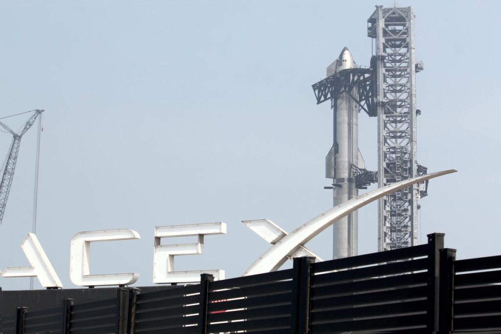 A Starship rocket looms behind a SpaceX sign at the company’s Starbase launch facility in South Texas.