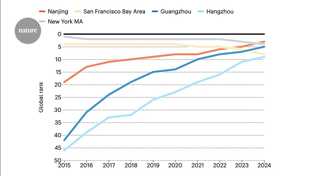 The biological sciences top 10 features mostly Western cities, led by New York and Boston. Beijing, in third place, is less than 30 Share points behind Boston. Guangzhou, meanwhile, has jumped from 13th place in 2023 to 9th.