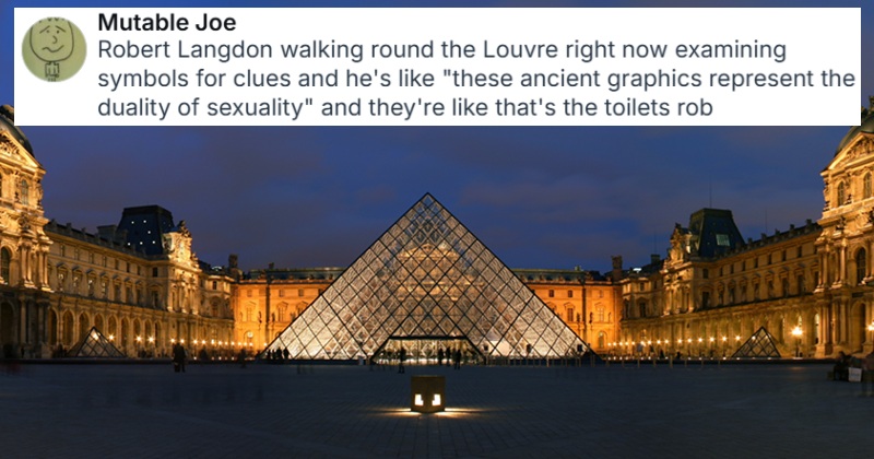 Robert Langdon walking round the Louvre right now examining symbols for clues and he’s like “these ancient graphics represent the duality of sexuality” and they’re like that’s the toilets rob