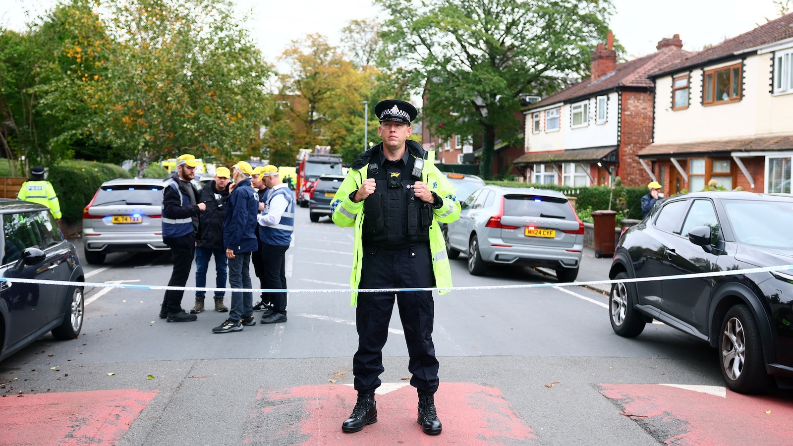 A police officer stands on duty at a cordon near Heaton Park Hebrew Congregation synagogue in Crumpsall, north Manchester, on October 2, 2025, following reports of a stabbing.