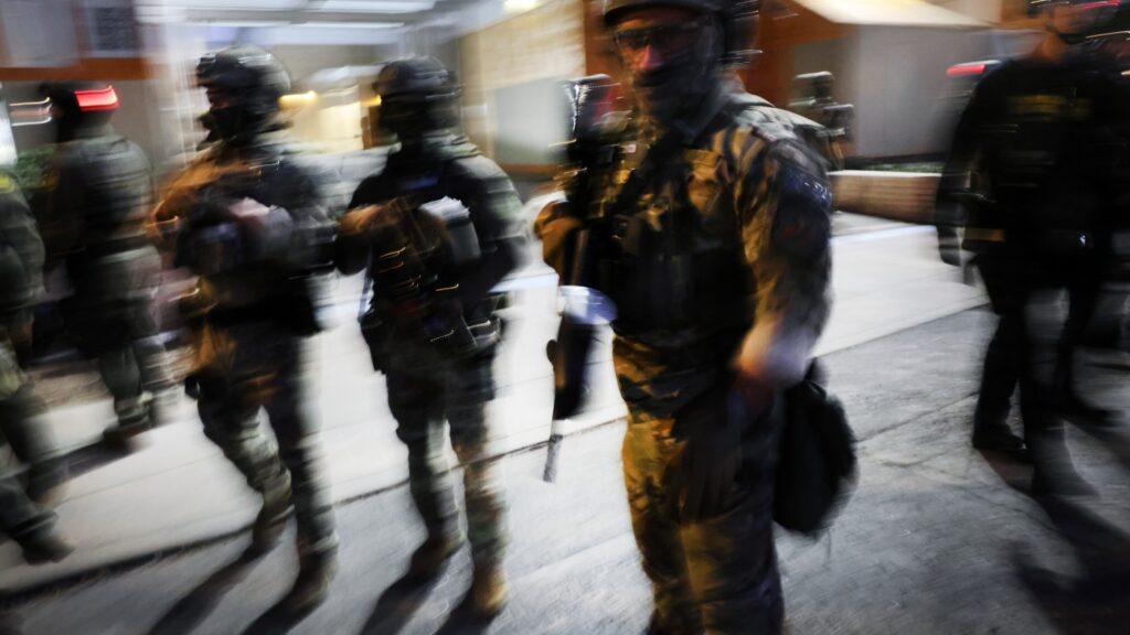 Federal agents, including members of the Department of Homeland Security, the Border Patrol, and police officers, attempt to keep protesters back outside a downtown U.S. Immigration and Customs Enforcement (ICE) facility on Oct. 6 in Portland, Oregon.