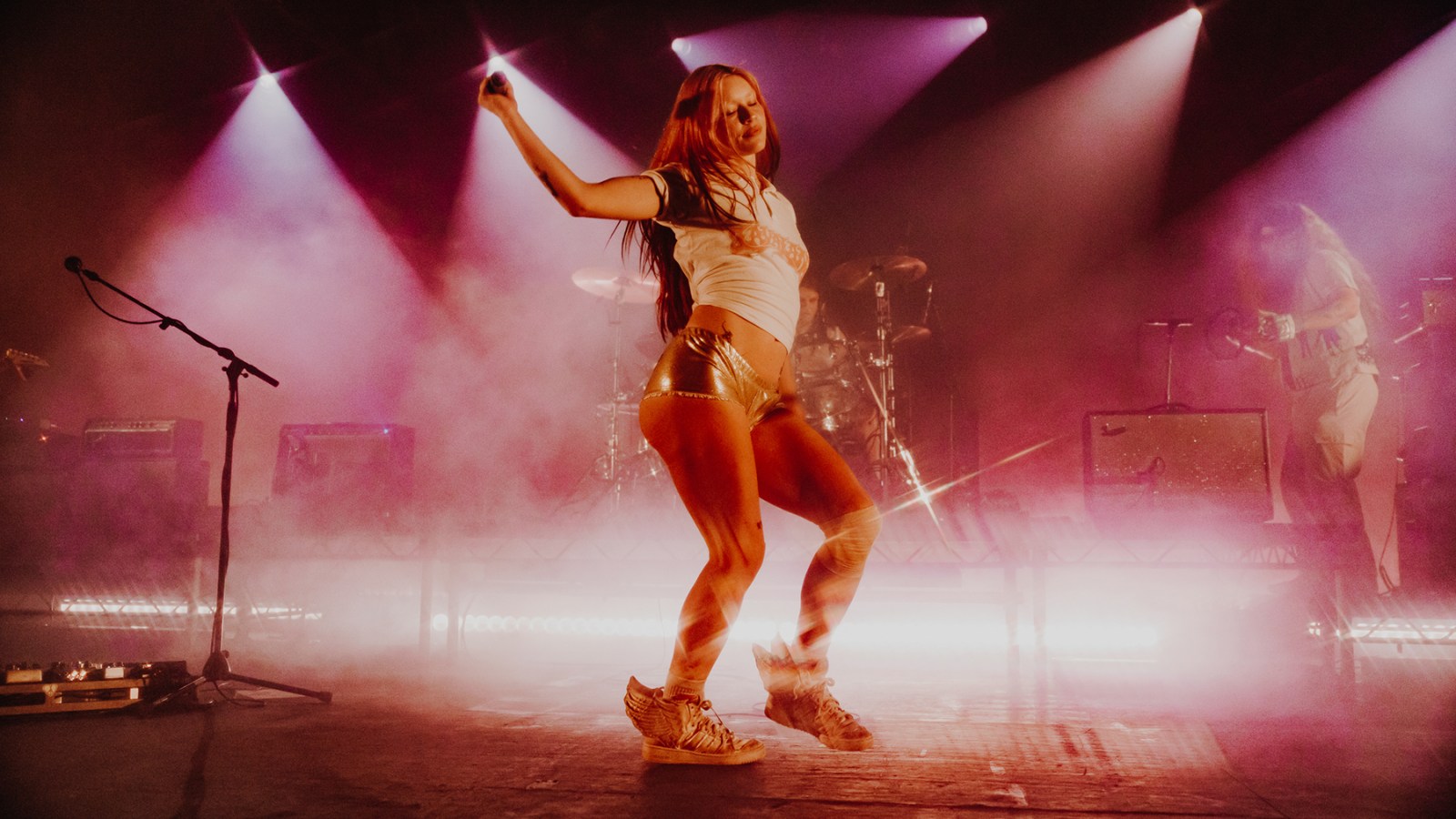 The aesthetic of the band, now a five-piece with guitarist Josh Mobaraki, bassist Ellis Durand, and drummer Henry Holmes officially members, has evolved drastically from the cottage-core vibes of their debut LP and their 2022 Glastonbury performance, where Teasdale and Chambers played in prairie dresses. At Gather No Moss, Teasdale opted for Rocky Horror metallic short shorts, a midriff-baring tee, and a knee bandage. Chambers, meanwhile, is leaning into shyness on this album cycle by frequently covering her face in photos. On Tuesday night, she found her shield beneath a large, sparkly cowboy hat. It was Nashville, after all.