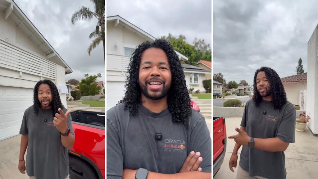 “So it’s really small, and it even has a five-foot bed, on something the same size as a Mini Cooper,” he continues. “On top of [it], I can fold down a midgate to give me an eight-foot bed. If I push this little black button right here, that gives me access to the gear tunnel … it comes standard with a Tesla plug, it can tow 6,600 pounds, and oh yeah — it makes 500 horsepower.”
