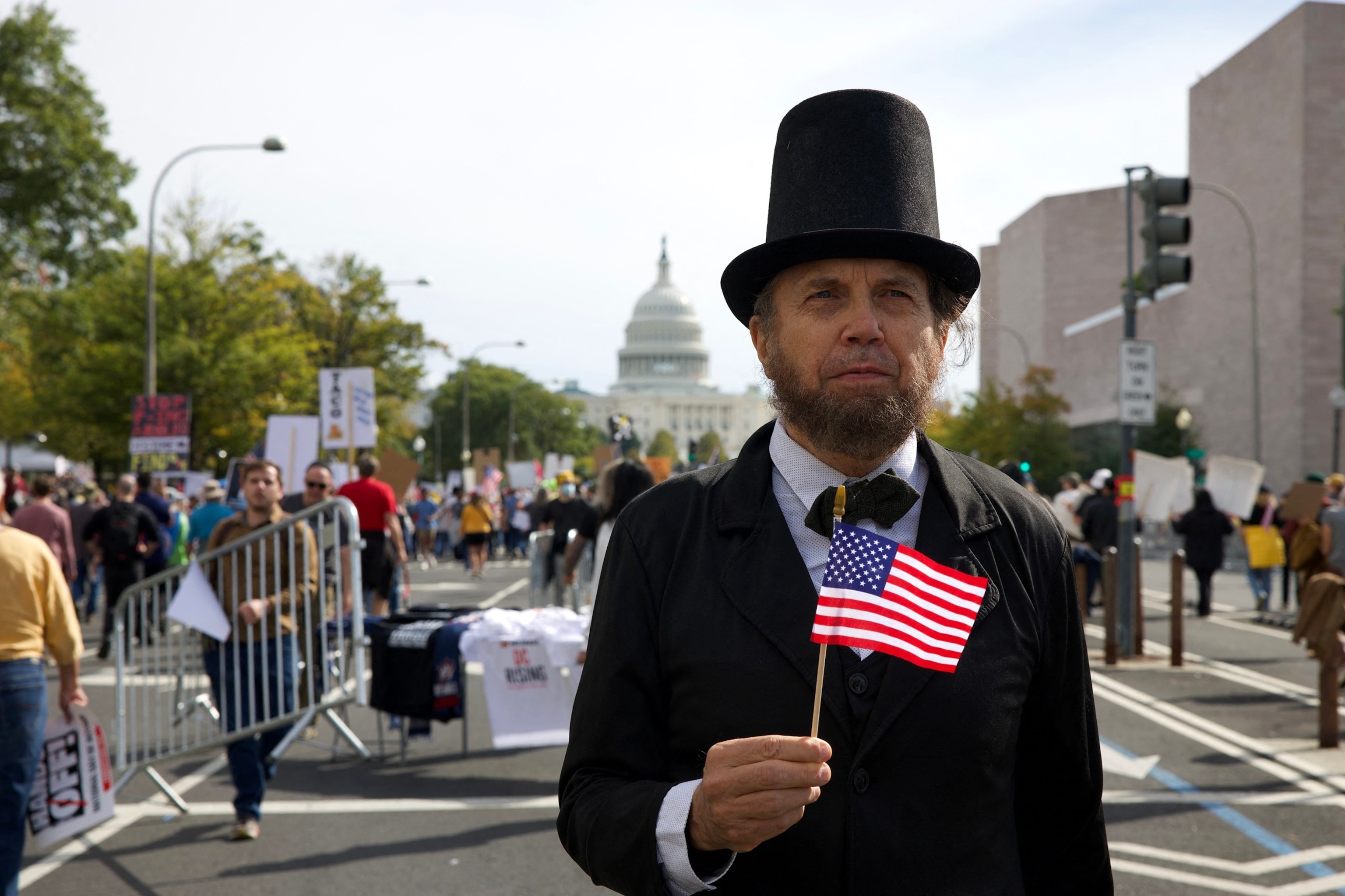 A man dressed as former President Abraham Lincoln holding an American flag participates in a “No Kings” national day of protest in Washington, D.C.,, on Oct. 18, 2025.