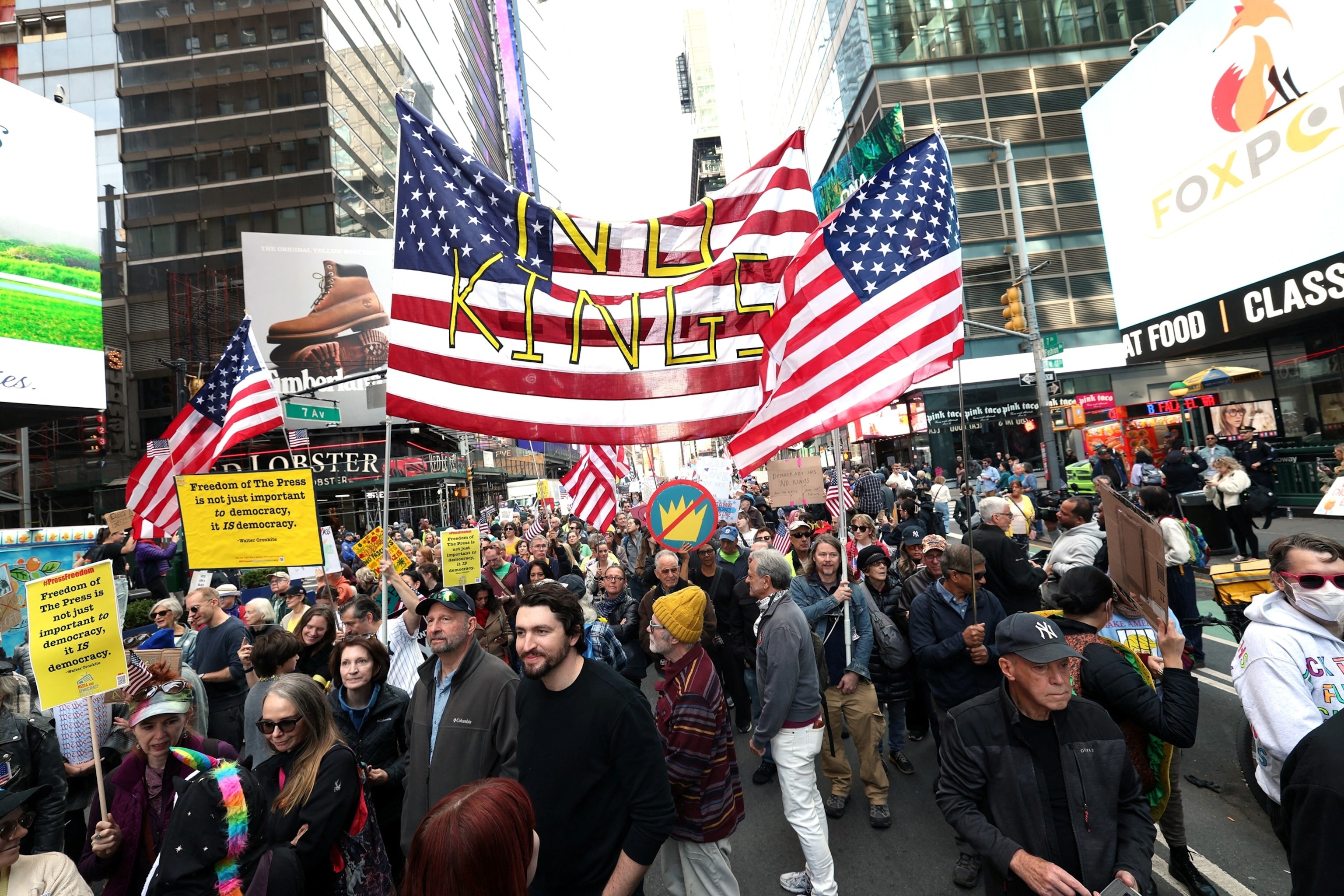 People participate in a “No Kings” national day of protest in New York, on Oct. 18, 2025.